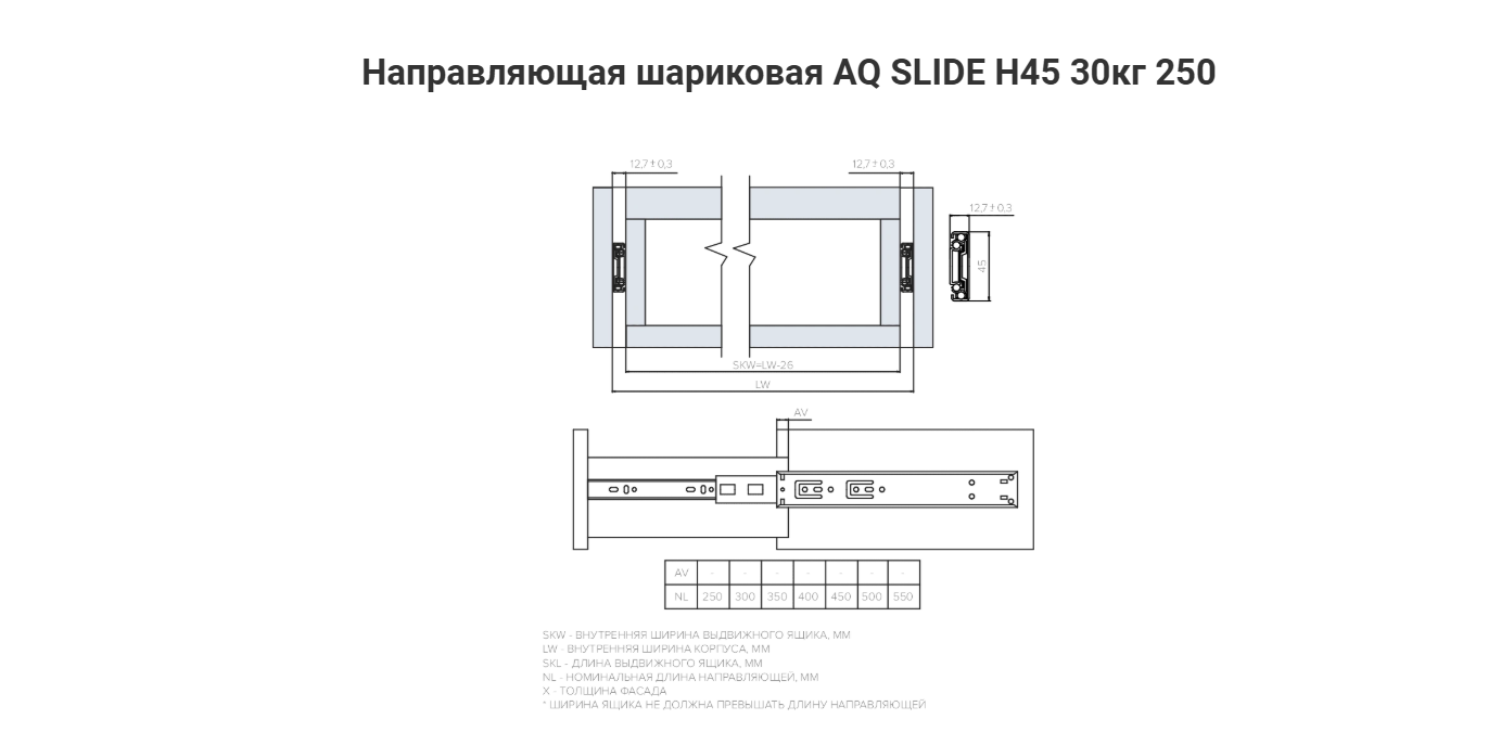 Направляющая шариковая 45\250 мм 30 кг. AQ SLIDE